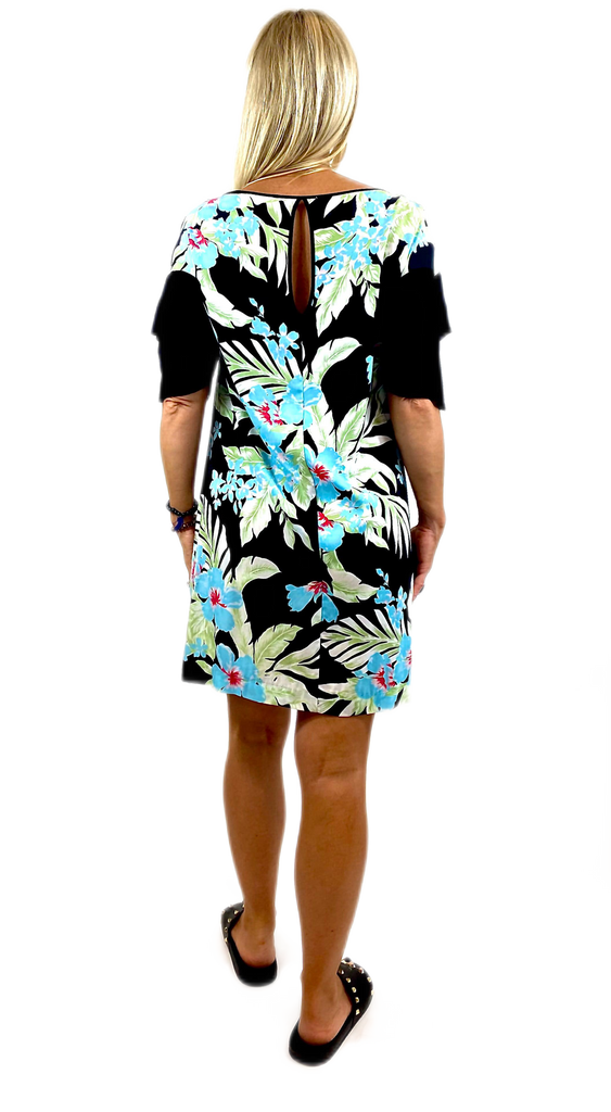 The Bali Knees Up Dress has a tucked viscose georgette sleeve on an A-line happy floral shaped dress which sits just above the knee.