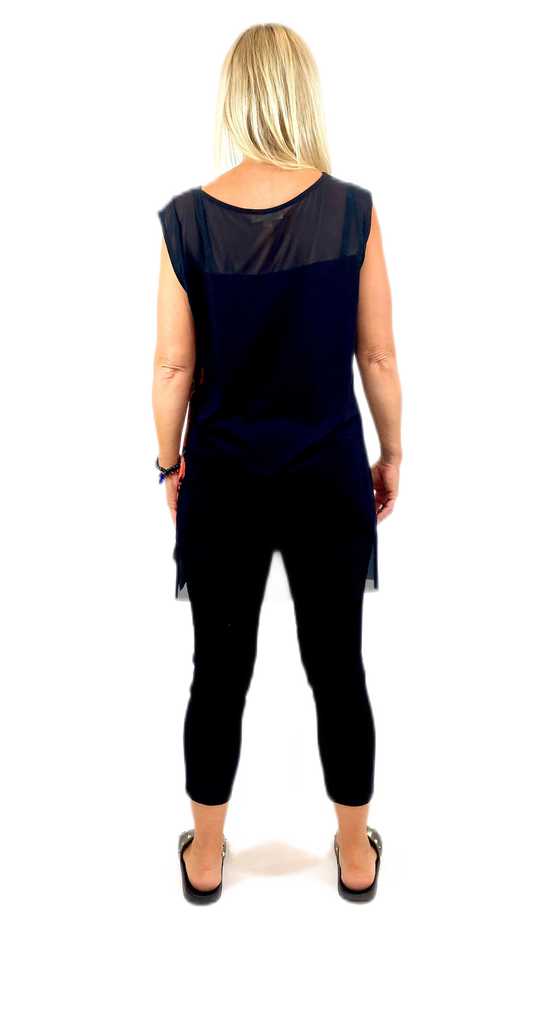 Silk with nylon mesh contrast sides and viscose spandex knit back.